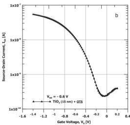 Low-voltage, high-performance organic field-effect transistors with an ultra-thin TiO2 layer as gate insulator | TlO2. 15nm | Anodic oxidation of Ti Constant-current mode (j = 0.5 mA/cm2)in 10-3 M citric acid (99+ %, Aldrich, UK) to the desired voltage VA=5 V, 10 V, and 20 V 2.4 uF/cm2